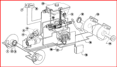 The following is a brief description of the ABS system components. The ABS system consists of the Electronic Brake Control Module (EBCM on 1987-1989 models), or Electronic Brake and Traction Contol Module (EBTCM on 1990-1992 models), a pump to generate hydraulic assist, the ABS master cylinder unit, and wheel sensors at each wheel to provide feedback. In the case of 1990 through 1992 Allante’s the Traction Control feature is integrated with the ABS system. There two are other components that come into play, the relay which runs the ABS pump, and one of the stop light switches. The ABS master cylinder has several major components: the sensor block, the accumulator, the pressure control switch, the fluid reservoir, the valve body, and the hydraulic unit. Some of these components will be discussed later on.